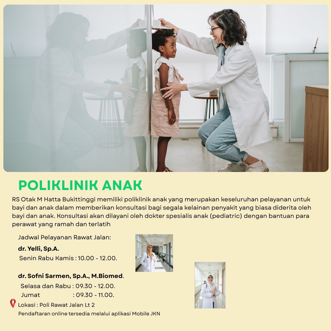 RS Otak M Hatta Bukittinggi memiliki poliklinik anak yang merupakan keseluruhan pelayanan untuk bayi dan anak dalam memberikan konsultasi bagi segala kelainan penyakit yang biasa diderita oleh bayi dan anak. Konsultasi akan dilayani oleh dokter spesialis anak (pediatric) dengan bantuan para perawat yang ramah dan terlatih.