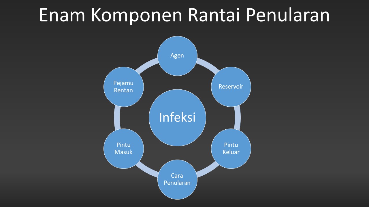 Ada 6 komponen rantai penularan, apabila satu mata rantai diputus atau dihilangkan, maka penularan infeksi dapat dicegah atau dihentikan sehingga infeksi-pun tidak akan terjadi.
