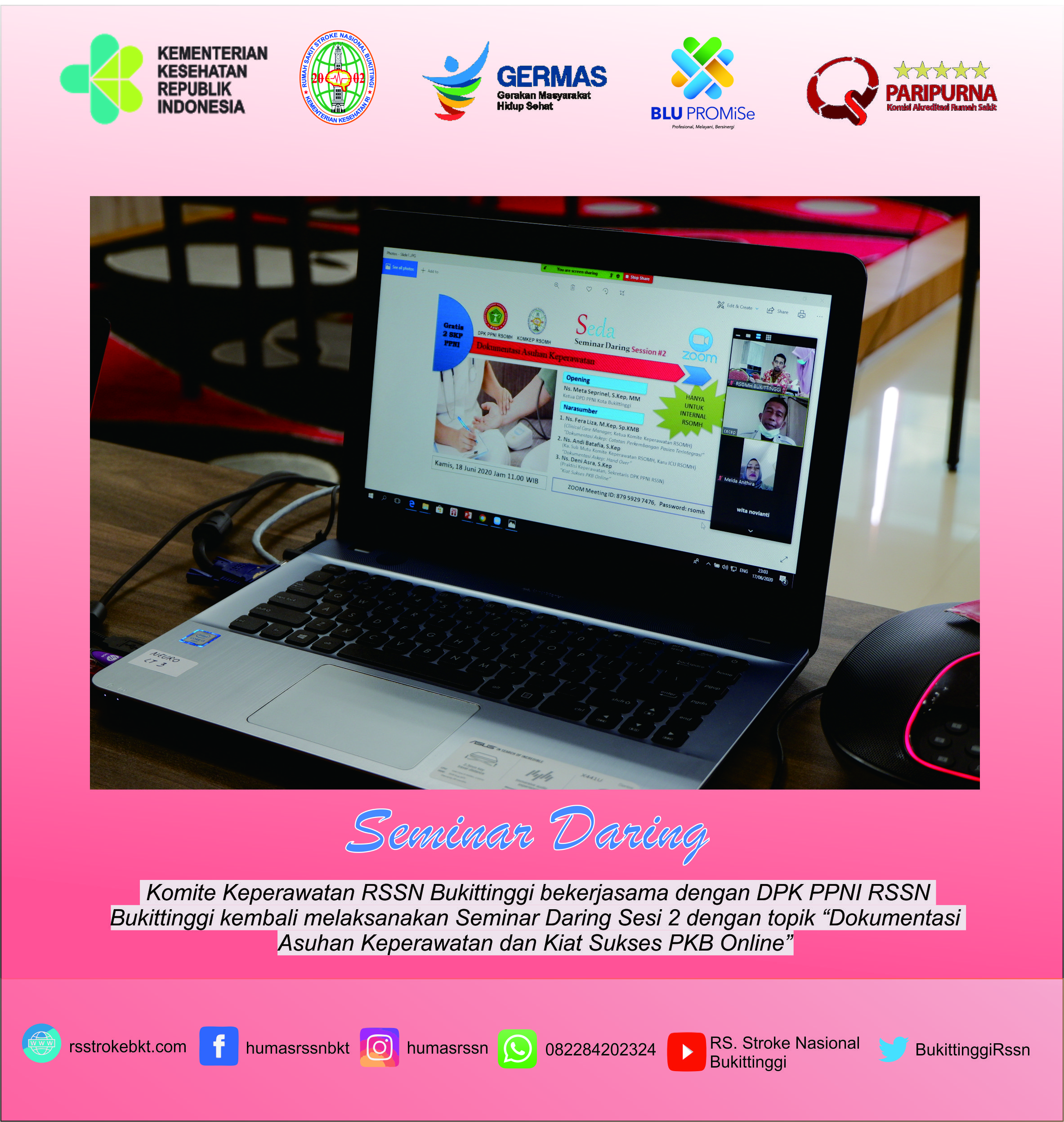 Kamis, 18 Juni 2020 Setelah sukses pada pelaksanaan Seminar Daring Sesi 1, Komite Keperawatan RSSN Bukittinggi bekerjasama dengan DPK PPNI RSSN Bukittinggi kembali melaksanakan Seminar Daring Sesi 2. Pada Seminar Daring kali ini, Tema yang diangkat adalah "Dokumentasi Asuhan Keperawatan dan Kiat Sukses PKB Online".