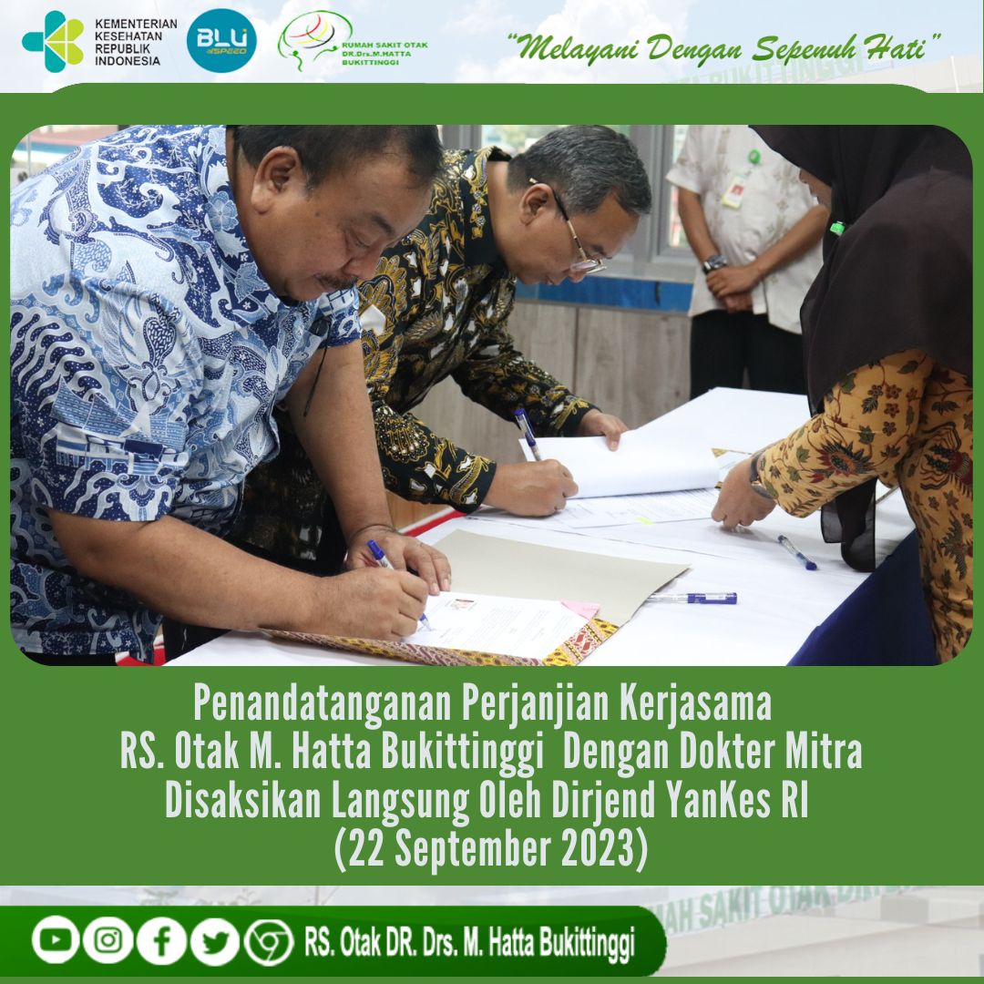 Pada tanggal 22 September 2023 tepatnya hari Jumat bertempat di Aula RS. Otak DR. Drs.M.Hatta Bukittinggi, penandatanganan Perjanjian Kerjasama (PKS) RSOMH Bukittinggi dengan Dokter Spesialis dilakukan secara khidmat. Acara penandatanganan perjanjian kerjasama yang didampingi oleh Plt.Direktur Utama RSOMH Bukittinggi Bapak Dr.dr.Yusirwan,.Sp.B.,Sp.BA (K).,M.A.R.S ini  juga  disaksikan secara langsung oleh Direktur Jenderal Pelayanan Kesehatan Kementerian Kesehatan RI  dr. Azhar Jaya, S.H.,S.K.M.,M.A.R.S. yang saat itu sedang melakukan kunjungan ke RSOMH Bukittinggi.