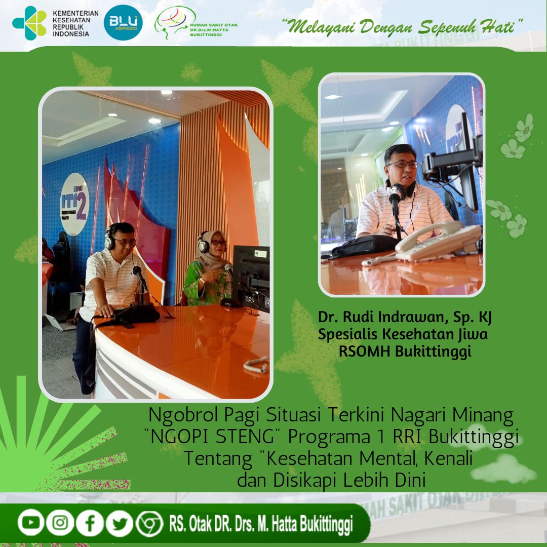 Hari ini (13/10/2023) dalam program NGOPI STENG atau Ngobrol Pagi Situasi Terkini Nagari Minang bersama Programa 1 Radio Republik Indonesia Bukittinggi diulas secara gamblang betapa pentingnya  Deteksi dini gangguan jiwa  agar pengobatan lebih efektif dan komplikasi lebih lanjut dapat dicegah pada seseorang dengan gangguan jiwa. Pada Program Ngopi Programa 1 RRI Bukittinggi kali ini Dr. Rudi Indrawan, Sp.KJ selaku narasumber menjelaskan gangguan mental pada seseorang dapat berdampak signifikan pada fungsi sehari-hari, hubungan, dan kesejahteraan individu secara keseluruhan sehingga  kemampuan untuk mengidentifikasi dan mengatasi masalah ini pada tahap awal adalah hal yang sangat penting.