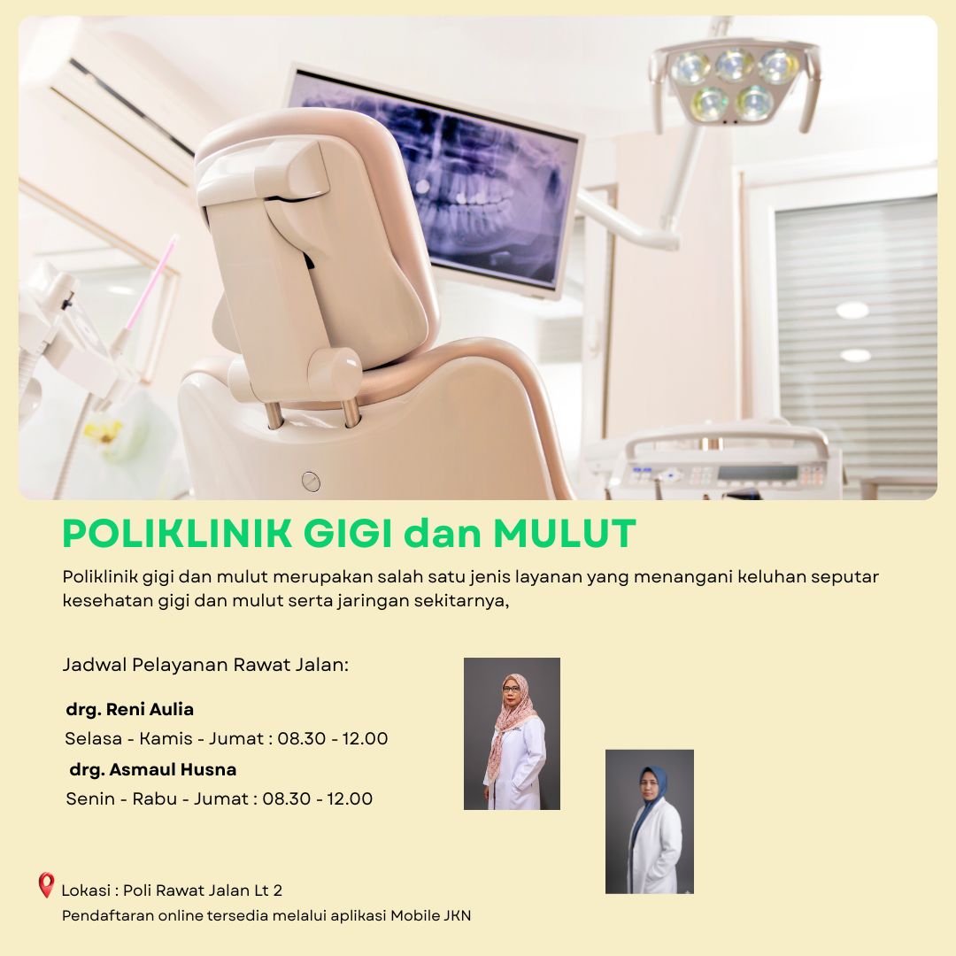 Poliklinik gigi dan mulut merupakan salah satu jenis layanan yang menangani keluhan seputar kesehatan gigi dan mulut serta jaringan sekitarnya,