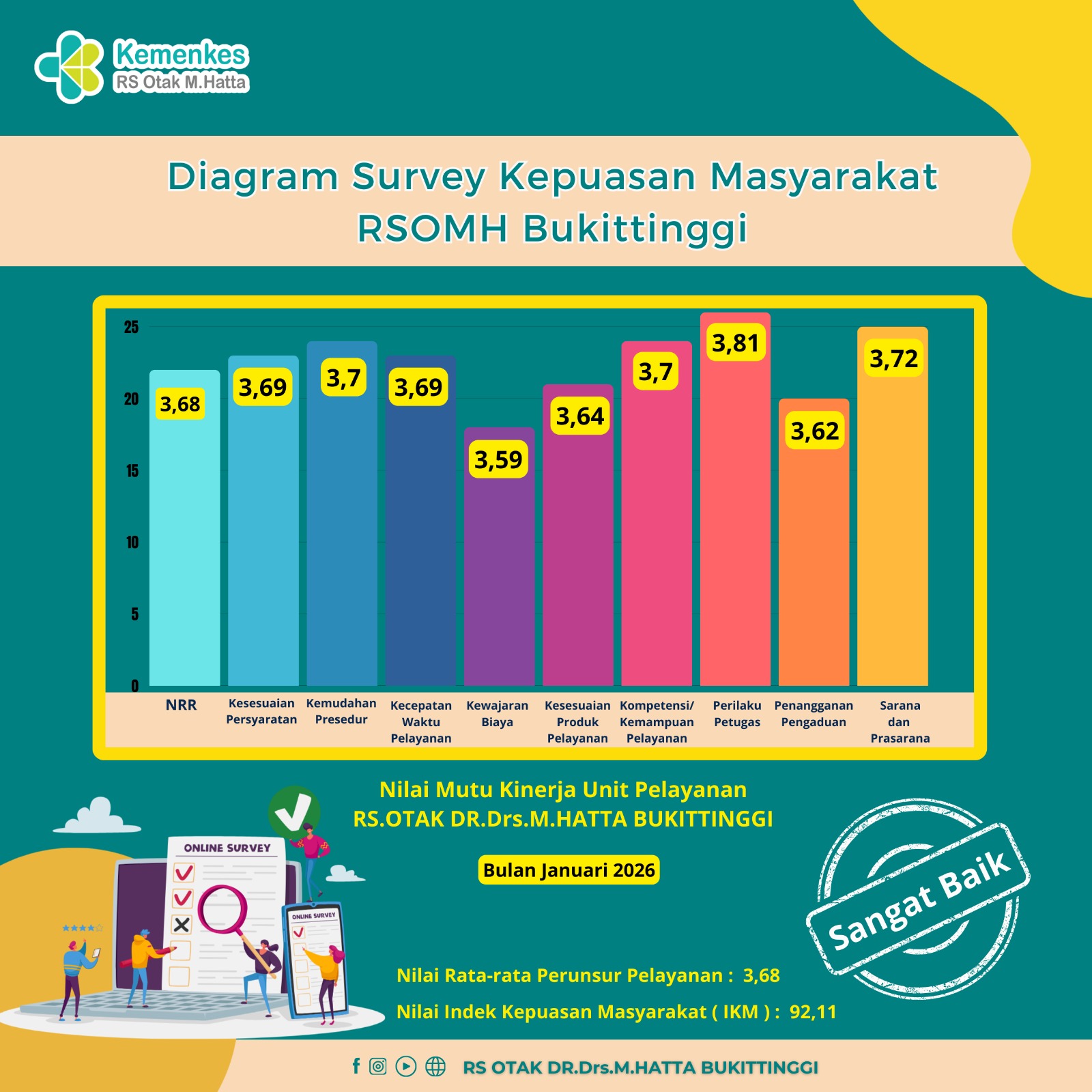 Rumah Sakit Otak Dr. Drs. M. Hatta (RSOMH) Bukittinggi mencatat capaian positif dalam hasil Survei Indeks Kepuasan Masyarakat (IKM) bulan Januari 2026. Berdasarkan hasil survei tersebut, RSOMH Bukittinggi memperoleh nilai IKM total sebesar 92,11, yang menunjukkan bahwa mutu pelayanan rumah sakit berada pada kategori sangat baik.